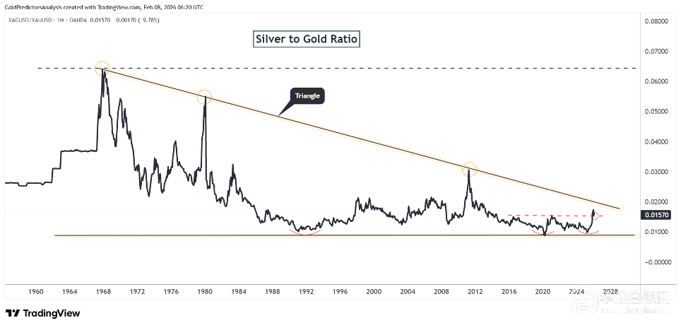 通过银价与金价的比值也能观察到银价的强劲走势,该比值显示已从长期支撑区域强劲反弹,这一反弹力度自1992年以来从未出现过。这种强劲的反弹形成了双底形态,即该比值正接近下跌趋势线的阻力位。