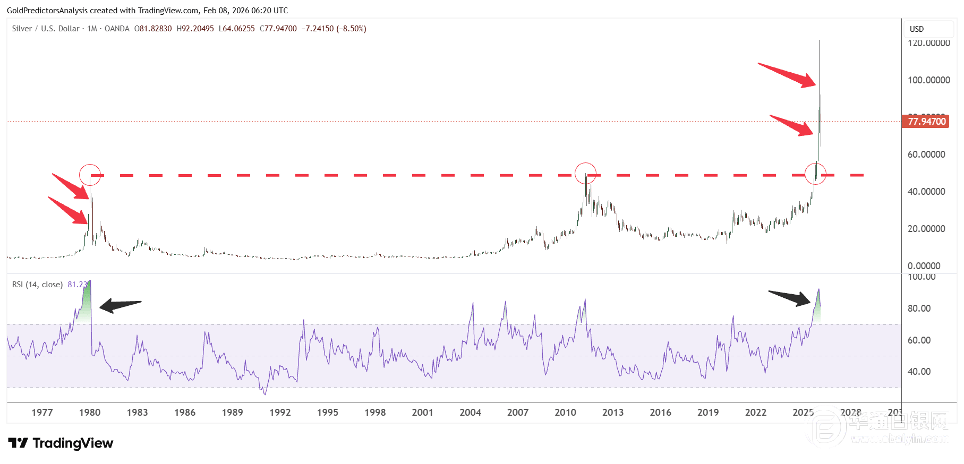 图表显示,在1979年和1980年也有类似的走势,当时RSI指数曾超过90。同样,在2026年,RSI也达到了相同的水平,此时价格在短期内和长期内都处于极度超买状态。这种超买状况需要一次重大的回调。从120美元下跌后,RSI已降至81.23,但这仍不符合当前的状况。