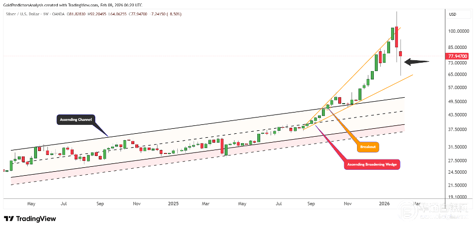 周线图显示,银价最高达到了120美元,此时已经极度超买,并且超过了上升扩散楔形形态的延伸线。这一延伸引发了强劲的反弹,重新回到了上升扩散楔形形态的支撑位64美元。