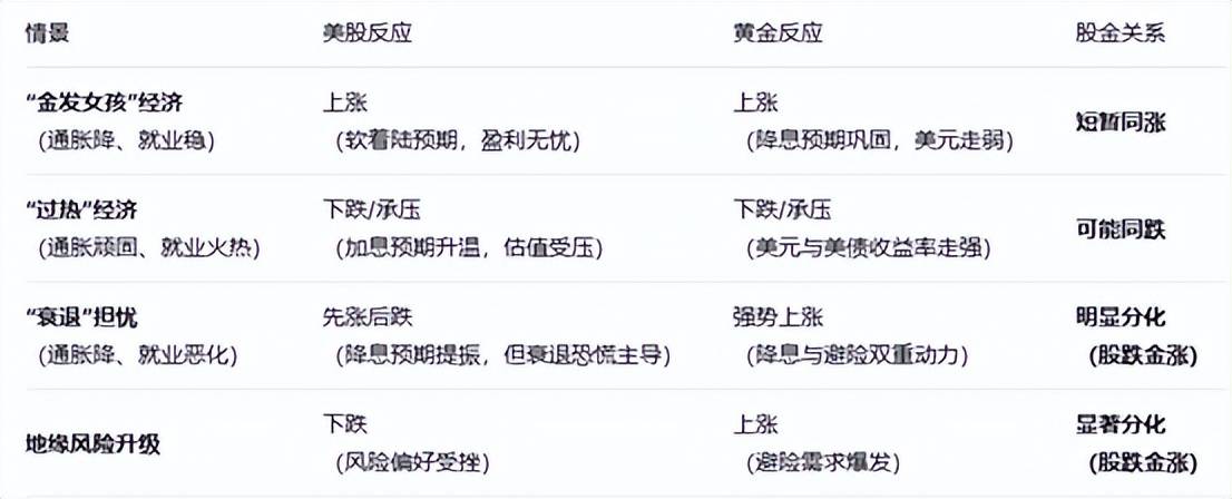 如果公布的CPI和非农数据呈现 “金发女孩经济” 组合——即通胀稳步下降、就业温和放缓但不衰退,这将同时提振两种资产:美股(软着陆预期,企业盈利无忧)和黄金(降息预期巩固,美元走弱)。但虽然两者短期内可能短暂同向,但中期内更可能呈现“跷跷板”或分化走势。黄金是“对冲”和“货币”,而美股是偏向“增长”和“收益”。当市场在“增长叙事”和“避险/降息叙事”之间切换时,它们的走势便会分化。