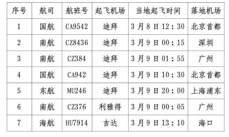 • 连日来,外交部和中国民航局全力协调,紧急派出航班协助滞留中东地区中国旅客回国。据了解,以下航班尚有余票。外交部领事保护中心建议,滞留中东地区的中国旅客抓紧时间通过以下航班回国,可登录各航空公司微信服务号或小程序购票。