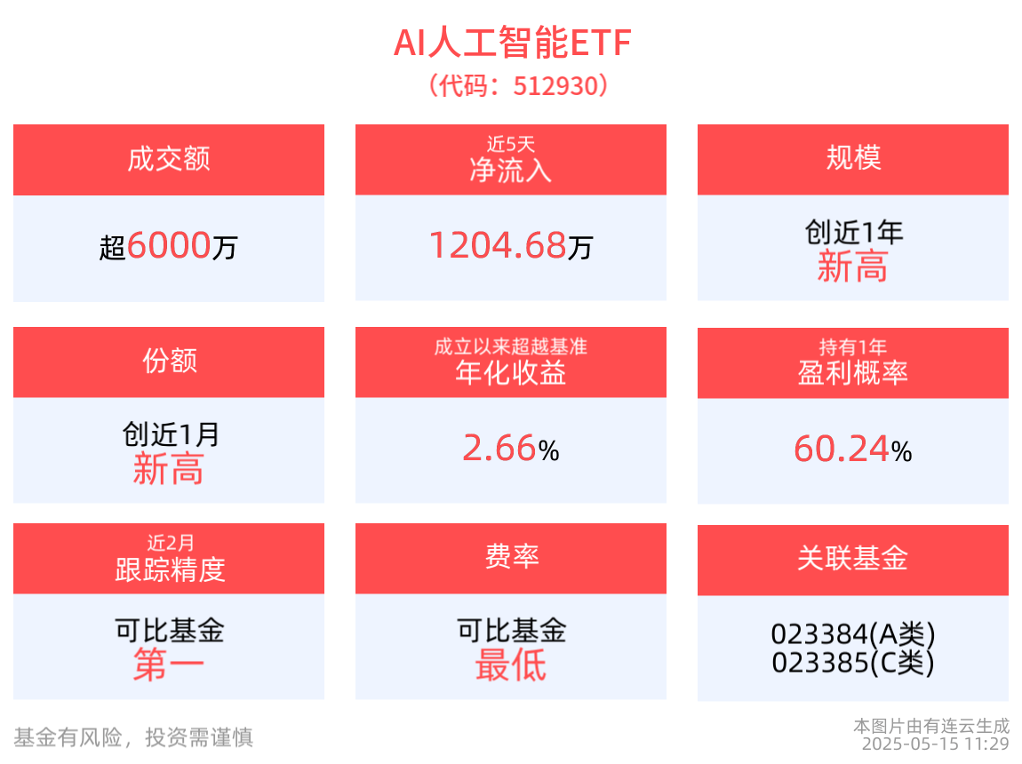 流动性方面,AI人工智能ETF盘中换手3.4%,成交6588.25万元。拉长时间看,截至5月14日,AI人工智能ETF近1年日均成交8778.53万元。