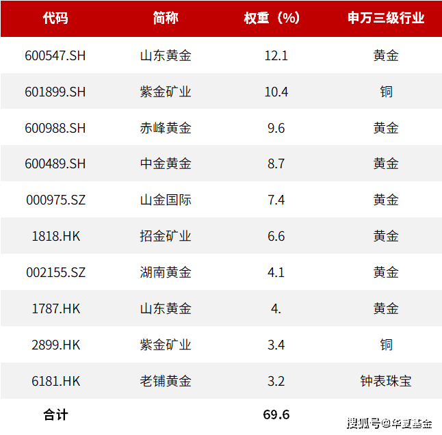 前十大权重股较为集中,清一色的金矿公司,合计占比近7成。