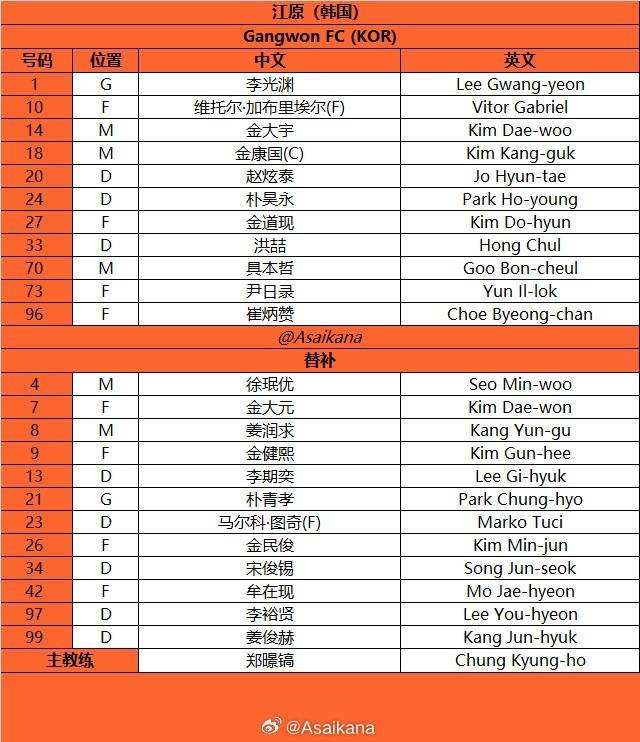江原FC首发:1-李光渊、20-赵炫泰、24-朴昊永、33-洪喆、14-金大宇、18-金康国、70-具本哲、10-维托尔·加布里埃尔(F)、27-金道现、73-尹日录、96-崔炳赞
