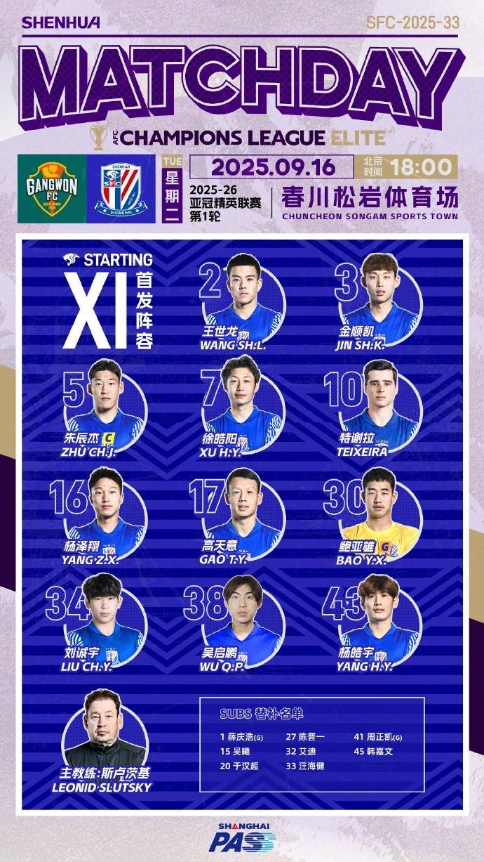 北京时间9月16日消息,今天18点,亚冠精英联赛东亚区的比赛将拉开战幕,上海申花客场对阵韩国球队江原FC,赛前首发阵容公布,由于联赛也正处在争冠的关键阶段,因此此役上海申花进行了了大幅度的轮换,仅特谢拉一名外援出战,此外18岁的小将吴启鹏上演职业生涯首秀。