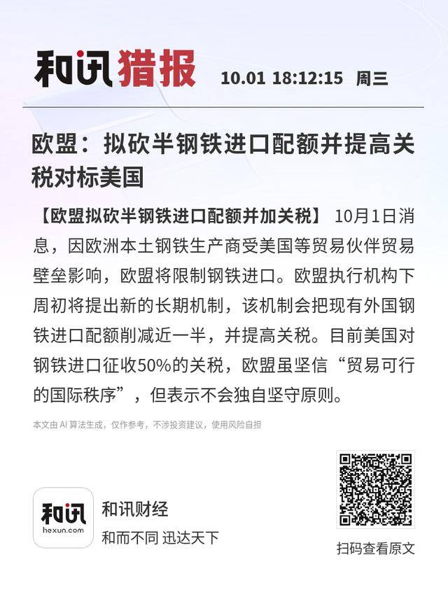 【欧盟拟砍半钢铁进口配额并加关税】10月1日消息,因欧洲本土钢铁生产商受美国等贸易伙伴贸易壁垒影响,欧盟将限制钢铁进口。欧盟执行机构下周初将提出新的长期机制,该机制会把现有外国钢铁进口配额削减近一半,并提高关税。目前美国对钢铁进口征收50%的关税,欧盟虽坚信“贸易可行的国际秩序”,但表示不会独自坚守原则。