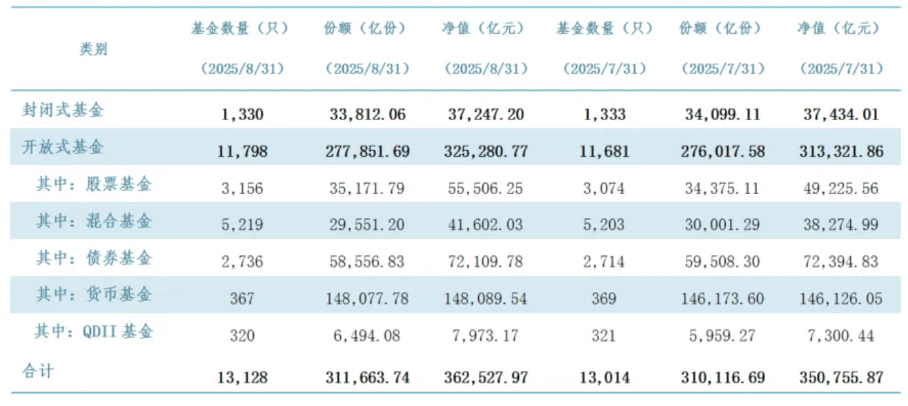 中国基金业协会最新发布的数据显示,截至2025年8月底,境内公募基金资产净值规模合计36.25万亿元。