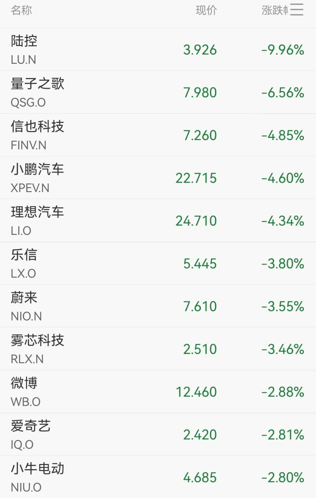 纳斯达克中国金龙指数跌幅扩至超0.8%,热门中概股普跌,小鹏汽车、理想汽车跌逾4%,蔚来跌逾3%,微博、爱奇艺、小牛电动等跌超2%。
