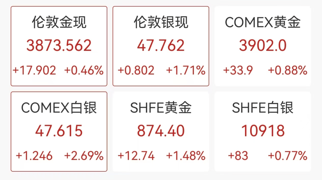 国际金价拉升,COMEX黄金期货站上3900美元/盎司,现货黄金也一度突破3890美元/盎司。COMEX白银涨近2.7%。