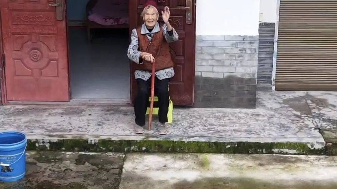 “空投”送达后,外婆朝无人机挥手。无人机拍摄画面截图