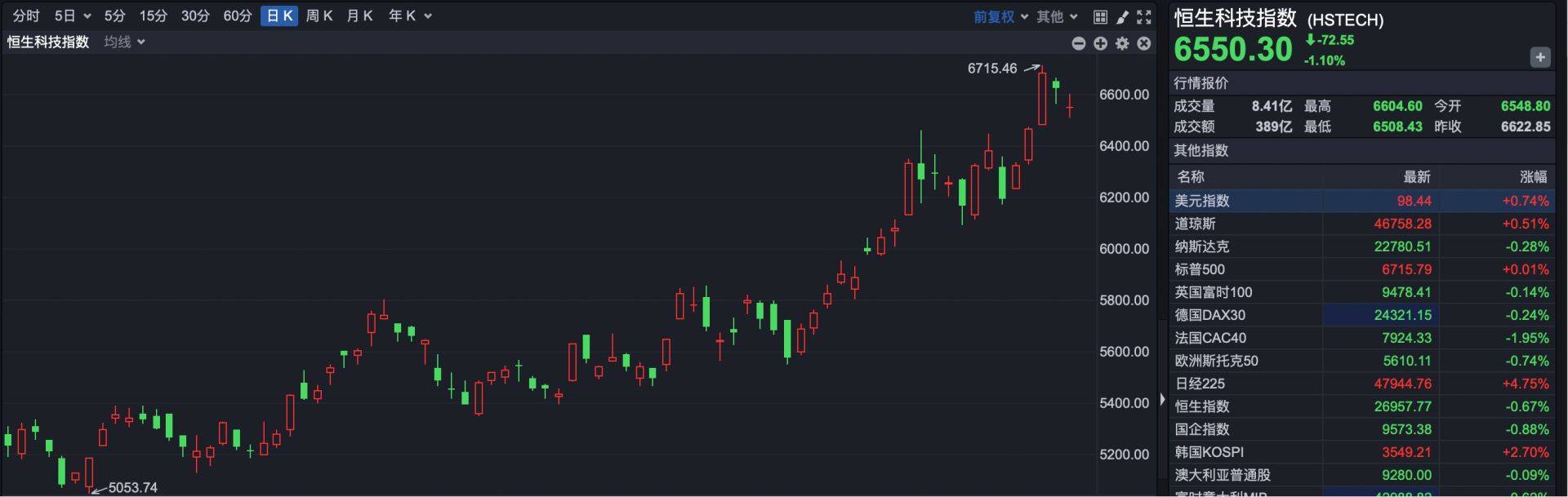 恒生科技指数报收于6550.03点,下跌72.55点,跌幅1.10%。