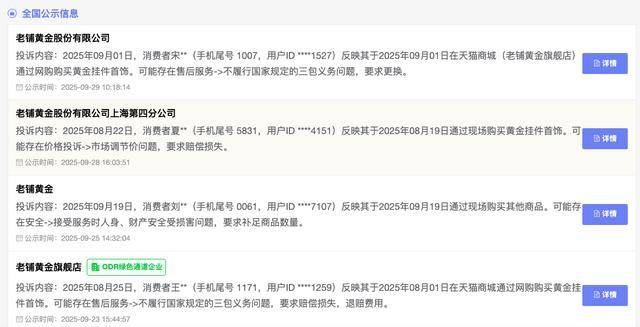 全国12315消费投诉信息公示平台显示,老铺黄金因市场调价问题,存在多起价格投诉,还涉及不履行国家规定的三包义务问题,消费者要求赔偿损失,退赔费用等。