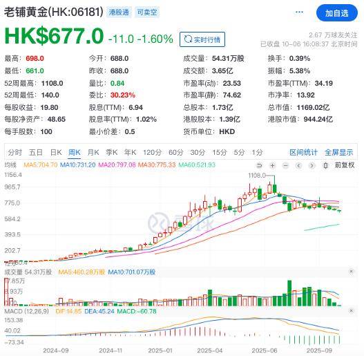 老铺黄金的近期走势与上市初期的狂热形成鲜明反差:2024年6月28日年上市后,其股价2024年全年涨幅接近500%;进入2025年延续涨势,截至7月8日收盘,该股股价报1082港元,较其40.5港元/股的发行价飙涨26倍,成为港股史上第十只“千元股”。