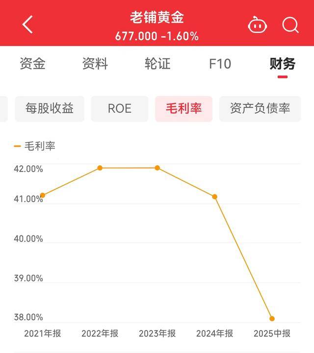 一是毛利率下滑,现金流持续“失血”。2025年上半年公司毛利率38.1%,同比下降3.24个百分点。公司方面解释称,是由于2025年上半年公司仅于2月进行了1次价格调整(一般每年调价2~3次),而调价后黄金价格持续快速上涨,影响了毛利率。