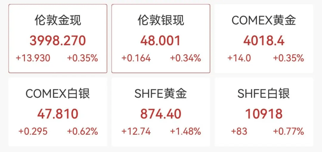 10月8日早盘,黄金期现货集体走高,现货黄金一度突破3999美元/盎司,续创历史新高,逼近4000美元/盎司;COMEX黄金期货持续走高,现报4018.4美元/盎司。