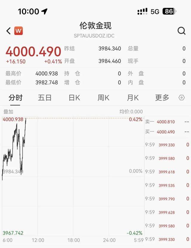 10月8日,伦敦现货黄金价格首次站上4000美元整数关口,再创历史新高。
