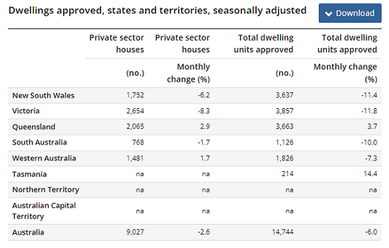 数据显示,8月份澳大利亚私营部门住房审批量环比下降2.6%至9,027套,不包括独立房在内的私营部门住房审批量则下降8.1%至5,408套。