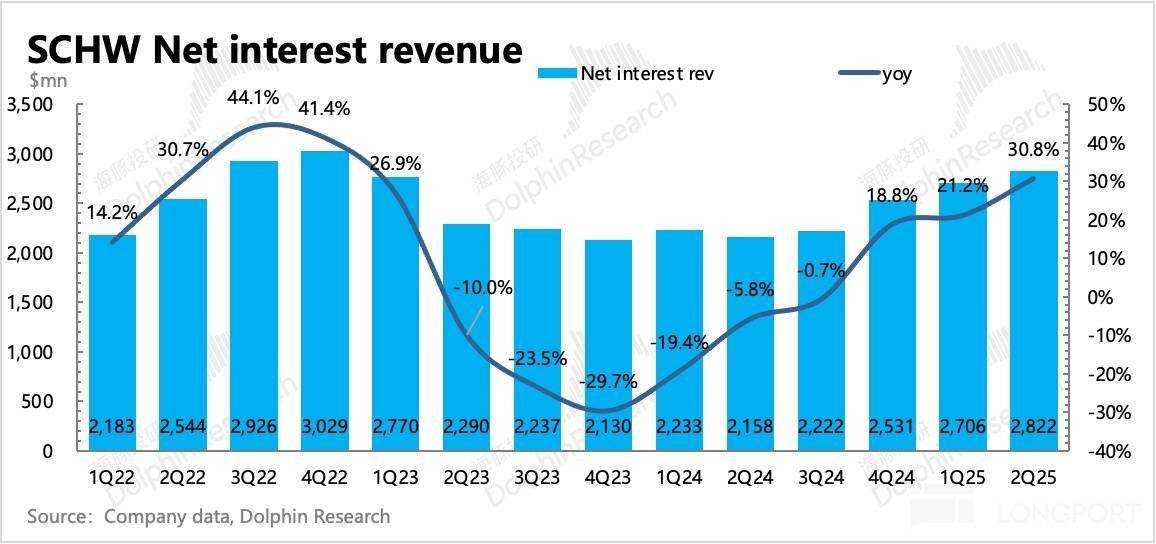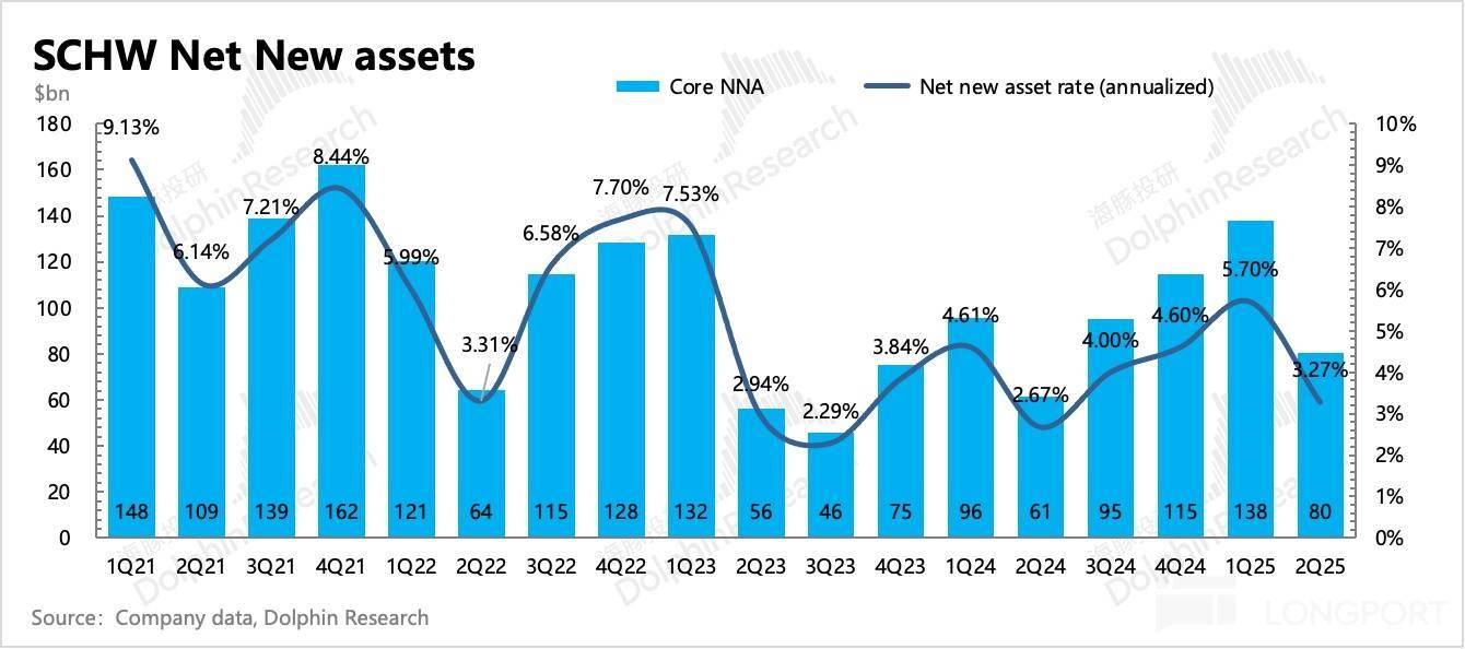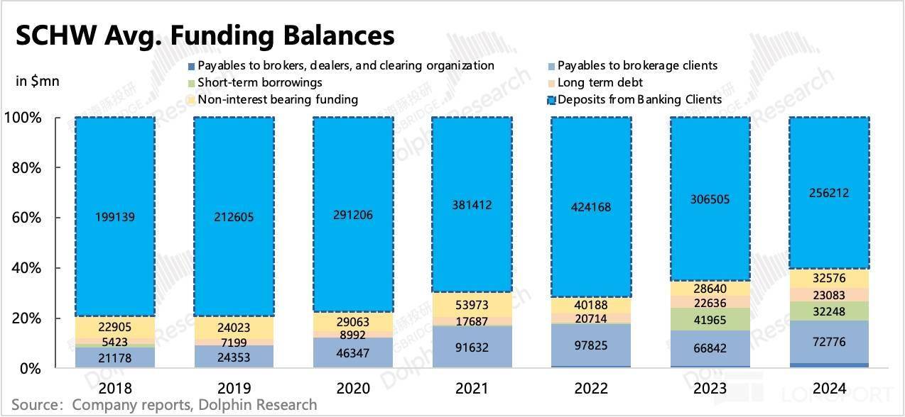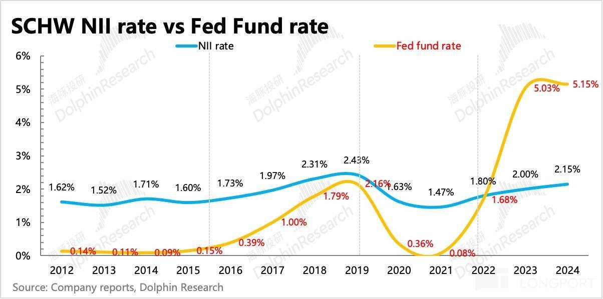 但聚沙成塔,在乘以千万账户的 “规模倍数” 后,对于嘉信来说则是一笔金额庞大的集体存款。以 2024 年为例,客户资产中现金存款总规模有 4500 亿,息差每扩大 100 个基点,对嘉信而言就是 45 亿的纯利净增。