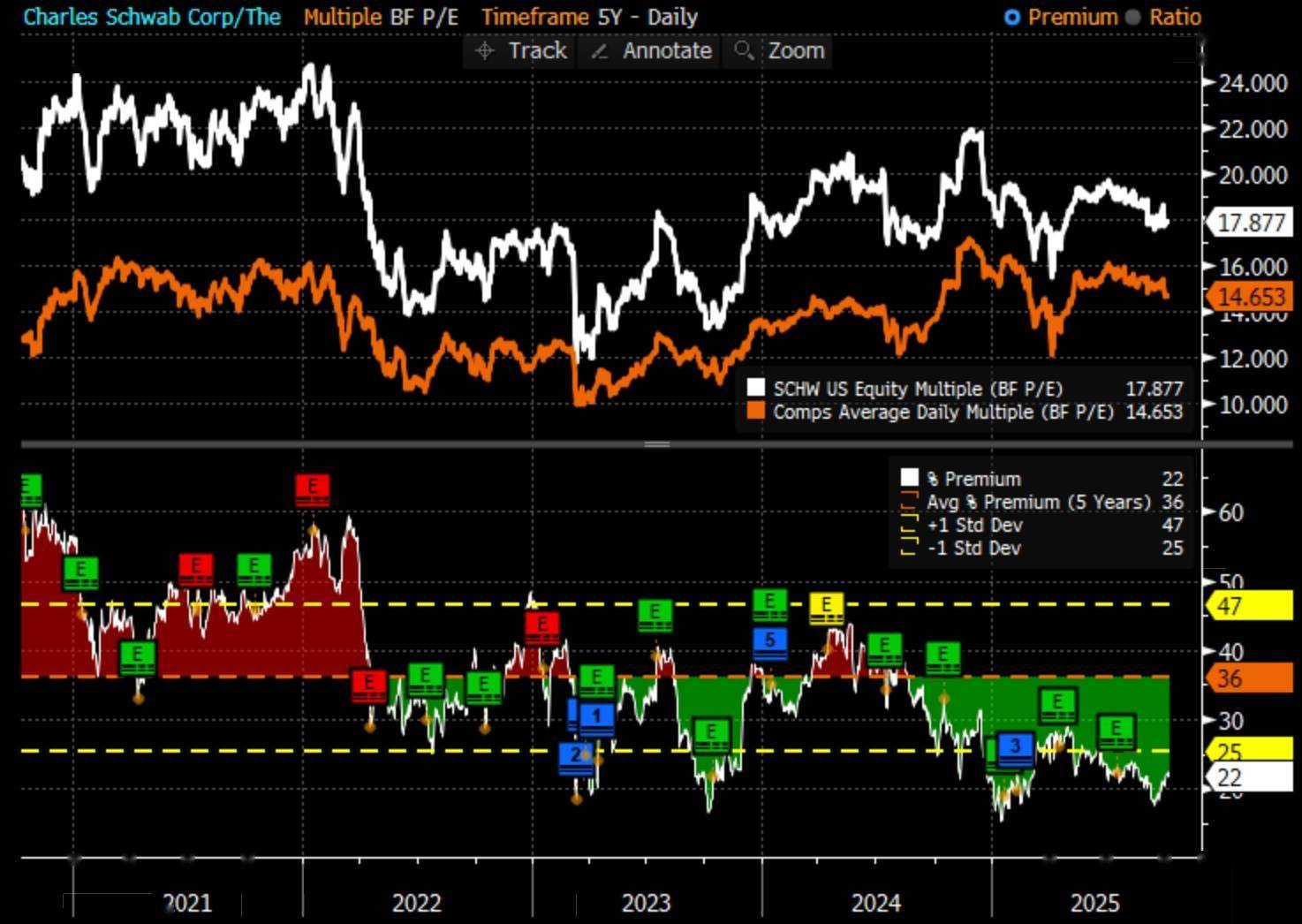 按照海豚君的预期,目前嘉信 1703 亿市值,交易于 26 年业绩的 17.5x P/E,基本贴合短期增速,估值修复的弹性空间不够诱人。横行对比看,估值还高于同行平均(综合金融平台)。