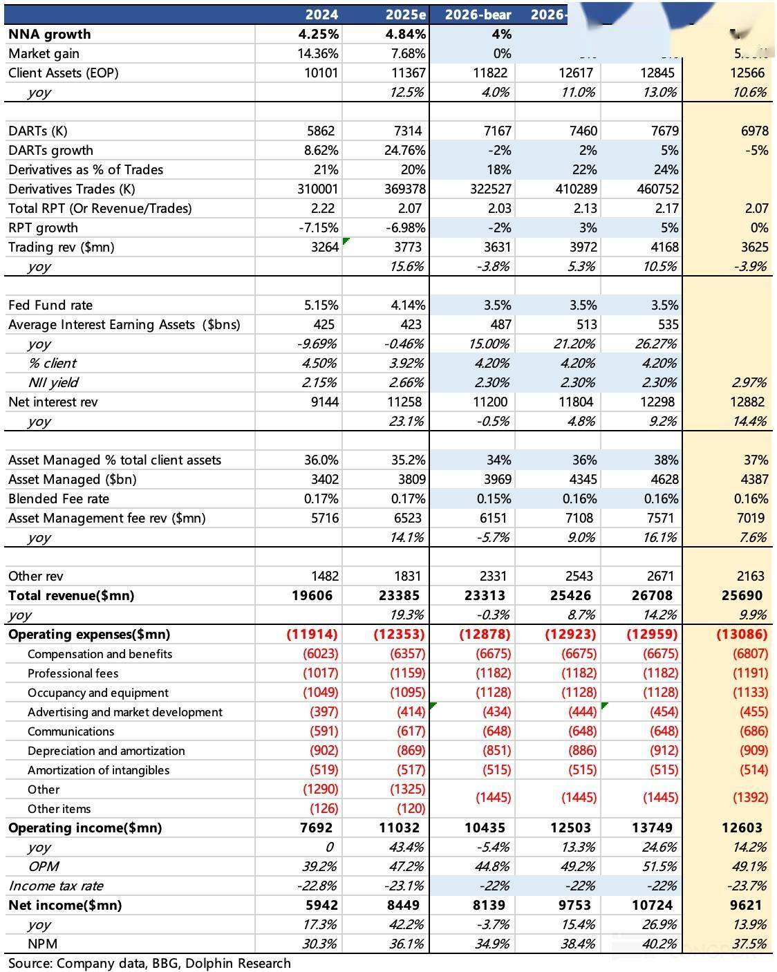 收入增长的核心驱动力,主要为净资产(NNA)的内生增速,费率要么稳定要么因竞争而普遍存在下降趋势。因此核心假设上,我们主要参照管理层指引(增速 5%~7%),对 NNA 增速预期为 4%/6%/8%,分别对应不同悲观、中性、乐观三个情景下。