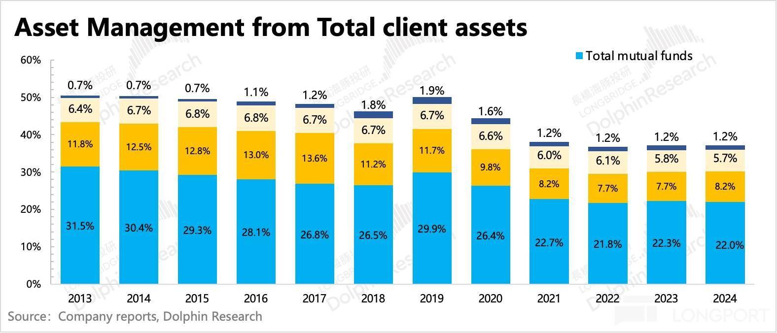 换句话说,尽管利息周期会带来短期扰动,但长期视角下,净息差增长的核心驱动还是客户总资产 AUM。利息业务如此,那就更不用说本身就与 AUM 直接关联的交易收入和财富管理收入了。