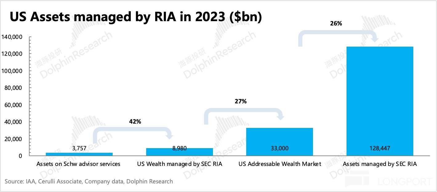 在收购 Ameritrade 后,嘉信已经超越 Fidelity 成为 RIA 托管龙头。从规模上看,嘉信平台上的 RIA 托管资产,在 2023 年的市占率就已经超过 40%。而从目前全行业 1.6 万个注册 RIA 机构中,其中 90% 都在嘉信上开设了托管账户,变相的为嘉信做了品牌宣传。