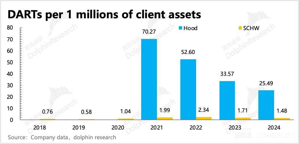 不过因为核心用户群体的风险偏好差异,整合后的嘉信用户交易频次(每一百万美元的客户资产日均交易次数),仍然不能和 Robinhood 相比,但嘉信也并非没有缩小差距的可能。(嘉信用户资产配置中基金 + 固收占比接近六成,只有 40% 为与交易相关的权益资产。而 Robinhood 用户将 90% 的资金都配置了高风险资产,其中 70% 为股票、20% 为加密货币。)