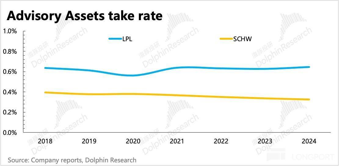 截至 2024 年,LPL 拥有近 2.9 万名个人投顾,服务资产规模 9570 亿;而嘉信拥有 1000 多名自有投顾,和 9000 多个外部 RIA 机构(大多为低于 5 名投顾的小机构),合计服务客户资产规模 5.6 万亿。简单直观比较,LPL 投顾单人平均管理资产的规模量级(约 3000 美元)要明显低于嘉信(1P+3P 合计来看,约 12000 美元)。