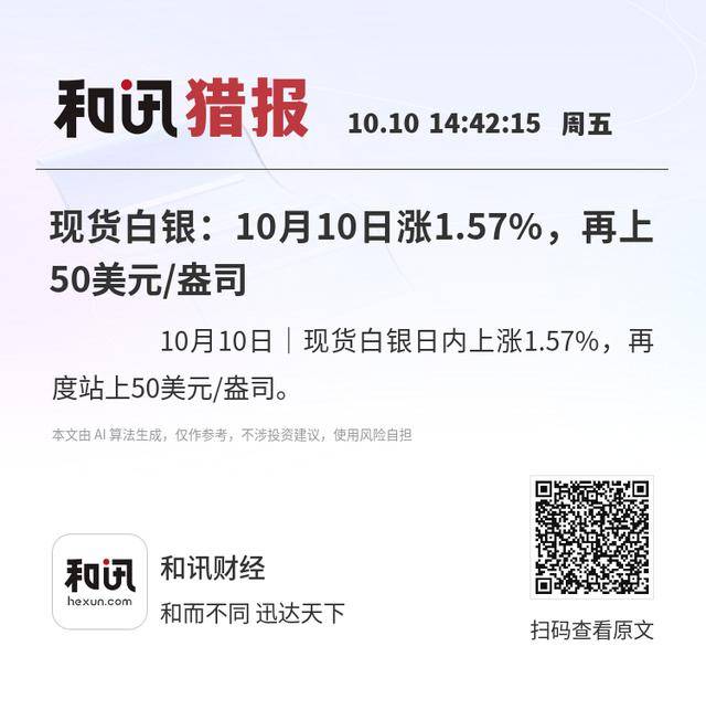 10月10日|现货白银日内上涨1.57%,再度站上50美元/盎司。