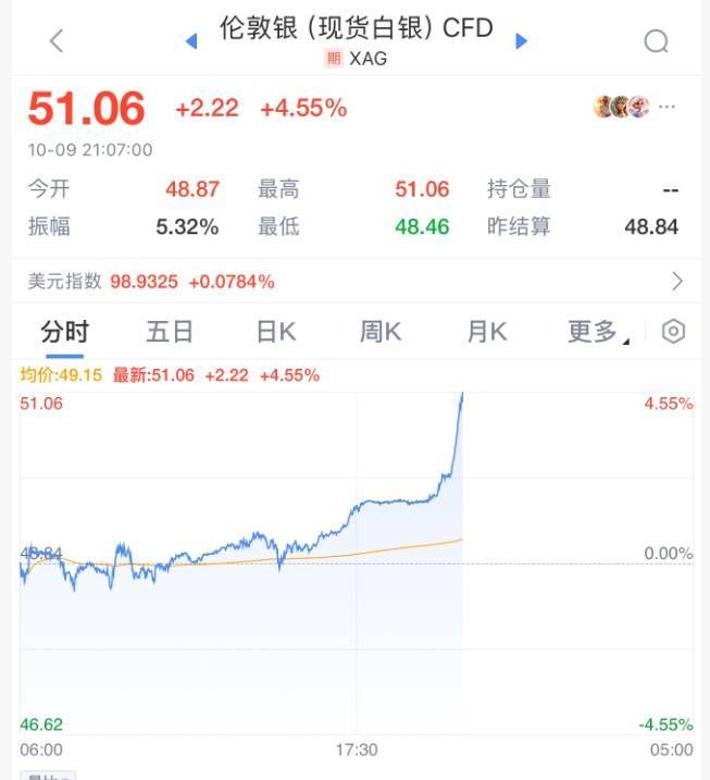 现货白银日内突破每盎司50美元,创20世纪80年代“亨特兄弟逼仓”以来最高水平。之后呈加速上涨之势,突破50美元整数大关后继续上攻51美元/盎司关口,涨幅扩大至4.5%,报51.06美元/盎司,继续创新高。