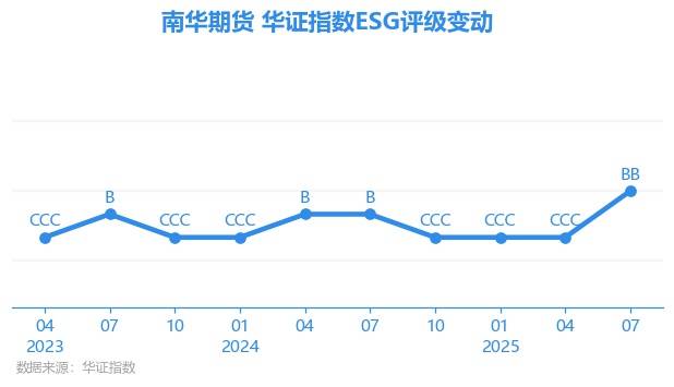 日前,华证指数公布了新一期(2025年7月31日)的ESG评级结果,南华期货(603093.SH)获得BB评级(华证指数评级为C起至AAA九档,C为最低档,AAA为其最高一级评级/AA为其第二档),上一期(2025年4月30日)ESG评级为CCC。本期ESG评级在22家金融服务行业A股上市公司中排名第9(上一期排名第9)。
