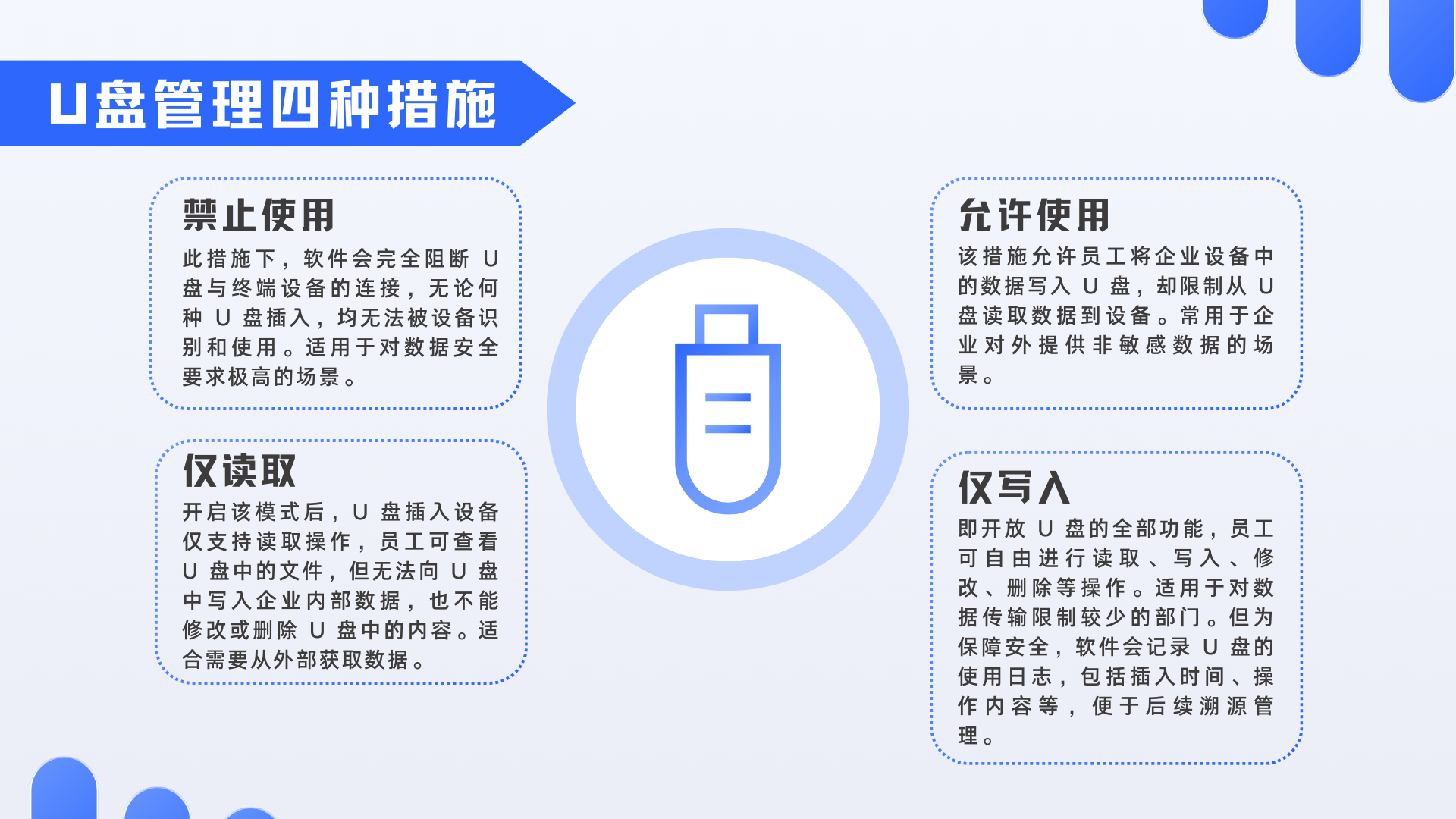 管理U盘的使用权限:提供“禁用/只读/只写/完全授权”四种基础权限,限制数据外传。