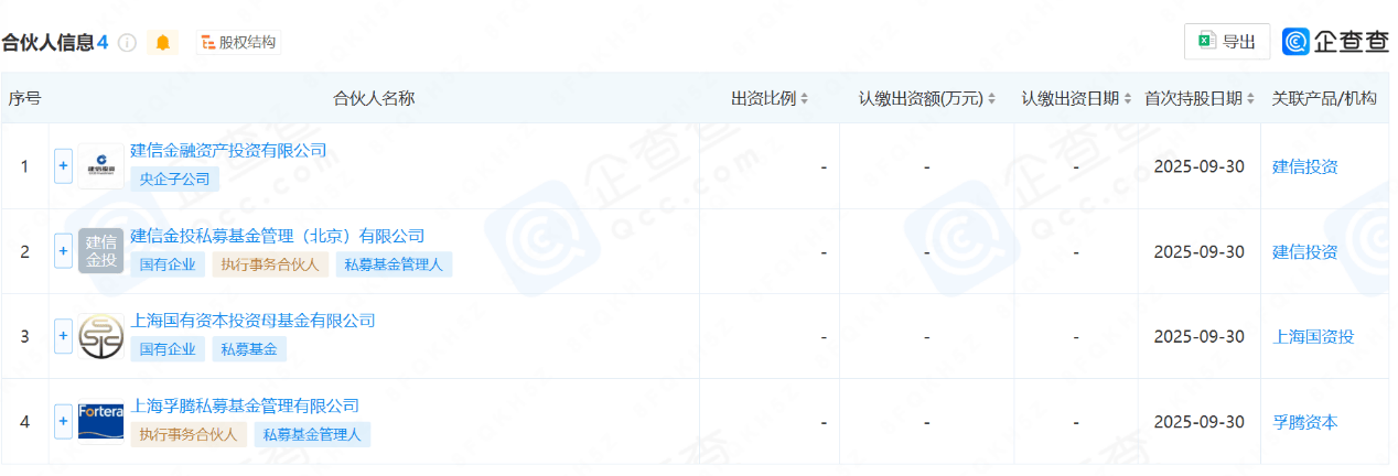 合伙人信息显示,该基金由建信金融资产投资有限公司、建信金投私募基金管理(北京)有限公司、上海孚腾私募基金管理有限公司、上海国有资本投资母基金有限公司共同出资。