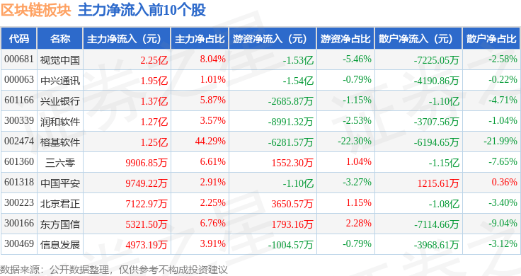 从资金流向上来看,当日区块链板块主力资金净流出32.2亿元,游资资金净流出2126.4万元,散户资金净流入32.41亿元。区块链板块个股资金流向见下表: