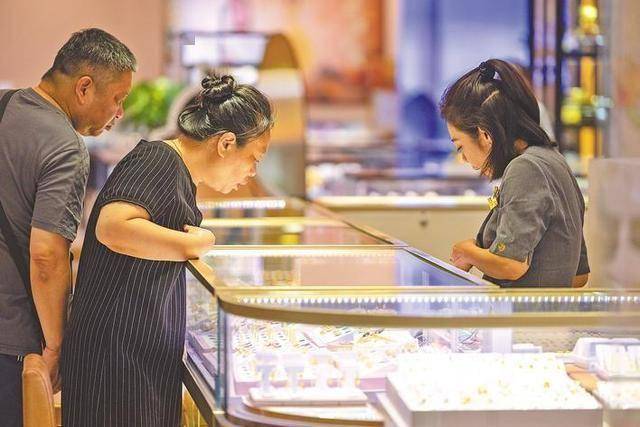 10月13日,现货黄金升至每盎司4060美元,再创历史新高。在武商MALL·世贸黄金珠宝区,不少品牌的黄金制品价格同步更新。图为顾客在选购金饰。