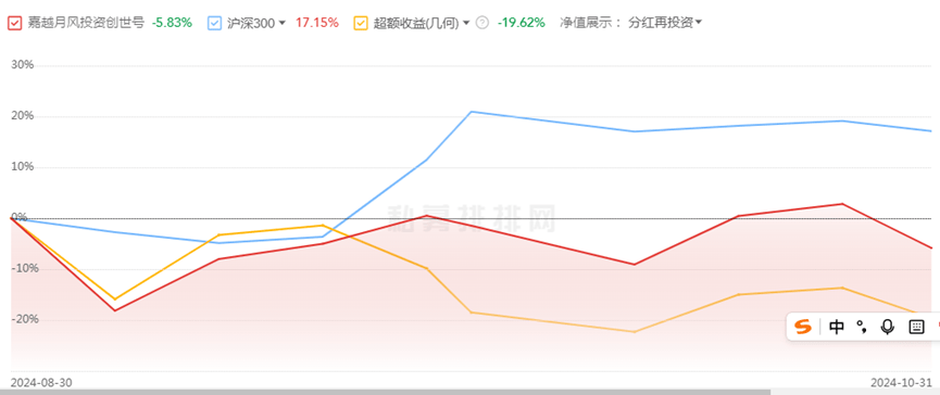 2024年的“924行情”就是一例,在大盘指数强势上攻之际,他的产品净值却表现得如同“置身事外”。(如下图)