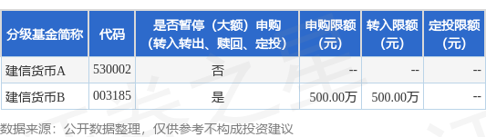 证券之星消息,10月15日建信基金管理有限责任公司发布《建信货币市场基金B类份额在部分渠道暂停大额申购、大额转换转入、定期定额投资公告》。公告中提示,为保护投资者利益,自2025年10月16日起建信货币市场基金B类份额在部分渠道暂停大额申购、大额转换转入、定期定额投资,申购、转换转入上限金额为500.0万元,下属分级基金调整明细如下:
