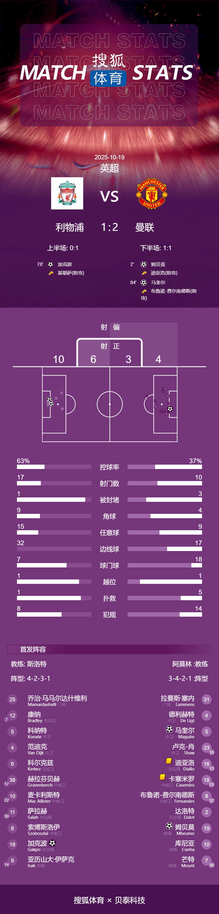 北京时间10月19日23时30分,2025-26赛季英超联赛第8轮焦点战打响,卫冕冠军利物浦坐镇安菲尔德球场1-2负于曼联,遭遇四连败,在英超积分榜上跌至第三位,落后榜首阿森纳4分;曼联收获英超两连胜,在积分榜上升至第9位,落后前四2分。姆伯莫开赛61秒闪击,连续三次击中门框的加克波第78分钟扳平比分,B费第84分钟助攻马奎尔头槌破门,攻入绝杀球。