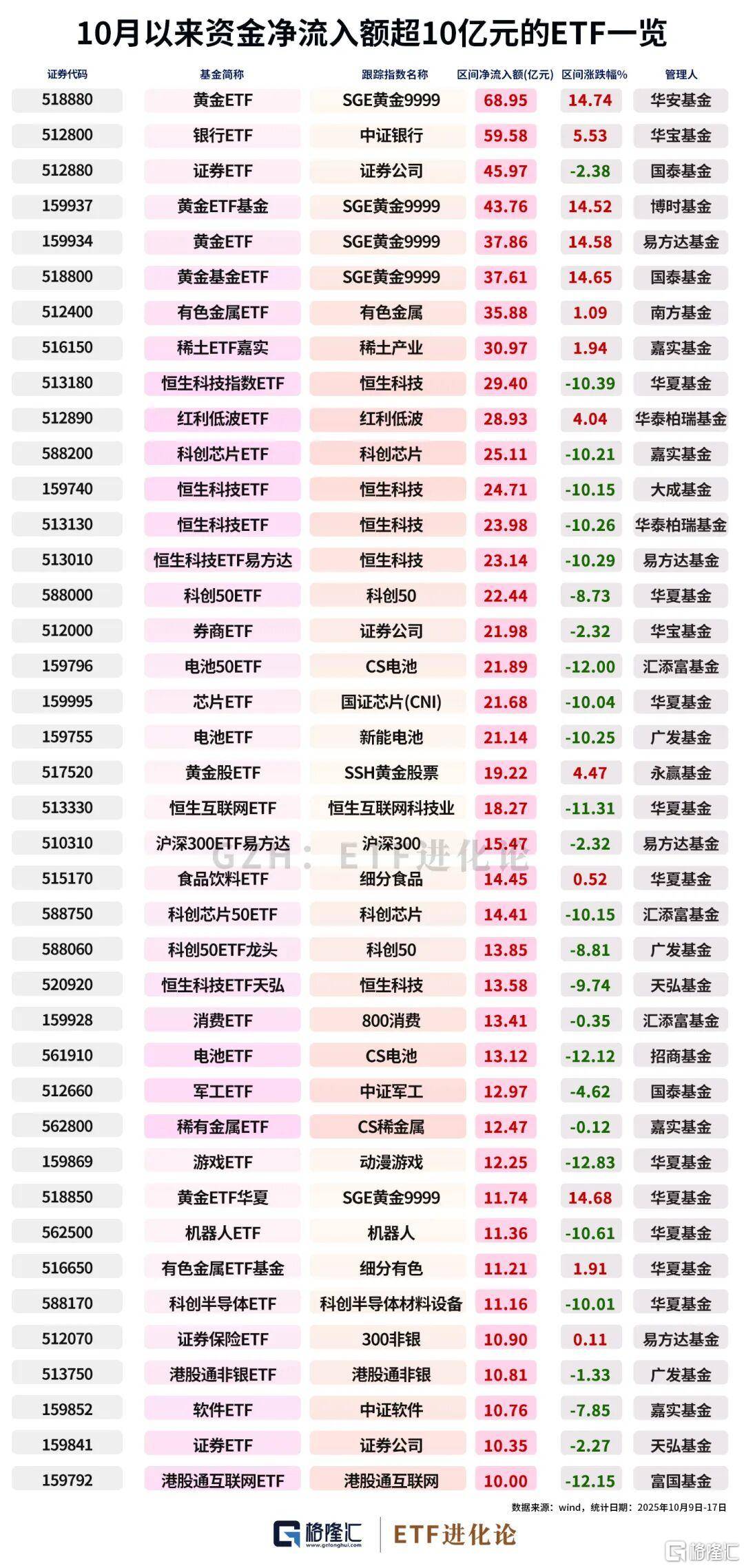 A股市场,10月以来ETF资金强势吸金,聚焦黄金和港股。