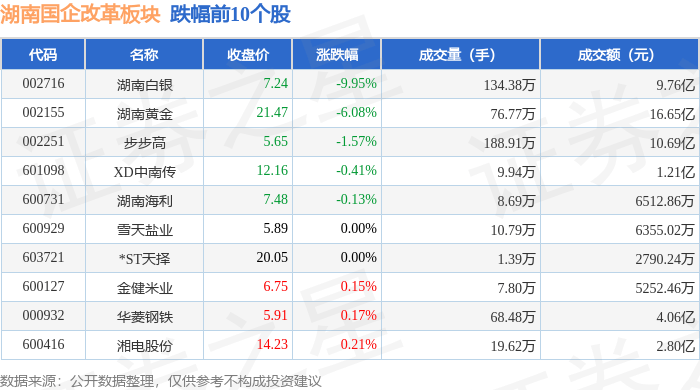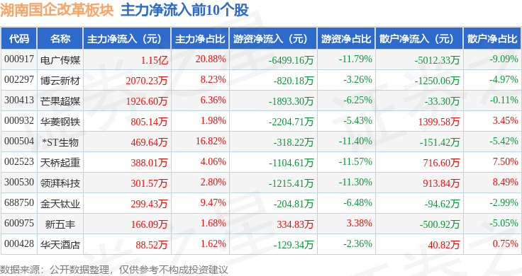 从资金流向上来看,当日湖南国企改革板块主力资金净流出2.78亿元,游资资金净流出1.2亿元,散户资金净流入3.98亿元。湖南国企改革板块个股资金流向见下表: