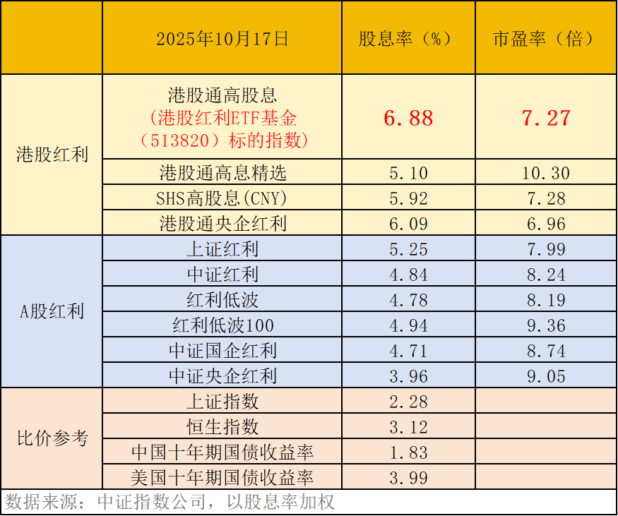 银河证券也表示,站在当下,面对全球经济增速放缓与资产波动的加剧,海内外资金正积极探寻具备避险属性的投资方向,基本面扎实、业绩韧性强且兼具防御特质的高股息资产有望持续受到青睐。与此同时,监管层持续引导上市公司优化分红机制、改善分红生态,或推动红利类资产投资成为长期结构性趋势。对于认可港股红利资产配置价值的投资者来说,投资跟踪相关指数的ETF,有助于把握相关投资机会。(来源于银河证券20251019《港股红利策略,又到“真香”时刻?》)