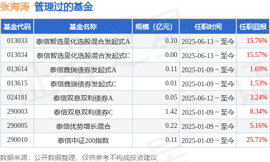 张海涛先生:中国国籍,研究生学历。曾任华夏基金管理有限公司资产配置部研究员,北京源峰私募基金管理合伙企业(有限合伙)研究部研究员。2024年9月加入泰信基金管理有限公司,曾任基金经理助理兼研究员,2025年1月任泰信中证200指数证券投资基金基金经理,2025年1月任泰信优势增长灵活配置混合型证券投资基金基金经理,2025年1月任泰信双息双利债券型证券投资基金基金经理,2025年1月任泰信鑫瑞债券型发起式证券投资基金基金经理。2025年1月9日任泰信中证200指数证券投资基金、泰信优势增长灵活配置混合型证券投资基金基金经理、泰信双息双利债券型证券投资基金基金经理、泰信鑫瑞债券型发起式证券投资基金基金经理。2025年6月13日担任泰信智选量化选股混合型发起式证券投资基金基金经理。