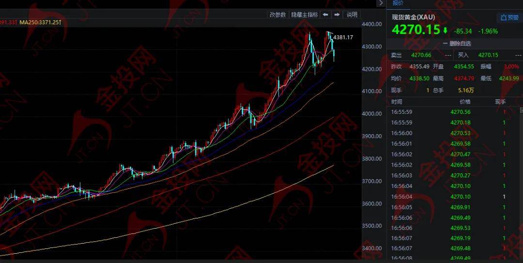 隔夜,现货黄金强势上涨逾2.5%,不仅收复了上周五的全部跌势,还一度刷新历史高点至4381.29美元,最终收报4356.26美元,涨幅约2.5%。今日欧市盘中,黄金大幅下跌失守4300美元关口,目前在4276美元附近徘徊。