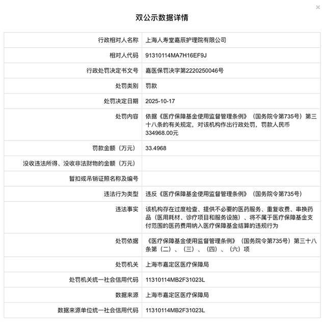 近日,上海市嘉定区医疗保障局披露了一起医疗保障基金使用违规案件,上海人寿堂嘉辰护理院有限公司因存在多项违反《医疗保障基金使用监督管理条例》(国务院令第735号)的行为,被依法处以罚款人民币334968.00元。