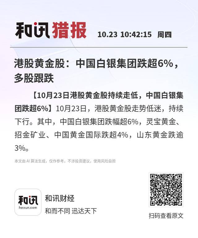 【10月23日港股黄金股持续走低,中国白银集团跌超6%】10月23日,港股黄金股走势低迷,持续下行。其中,中国白银集团跌幅超6%,灵宝黄金、招金矿业、中国黄金国际跌超4%,山东黄金跌逾3%。
