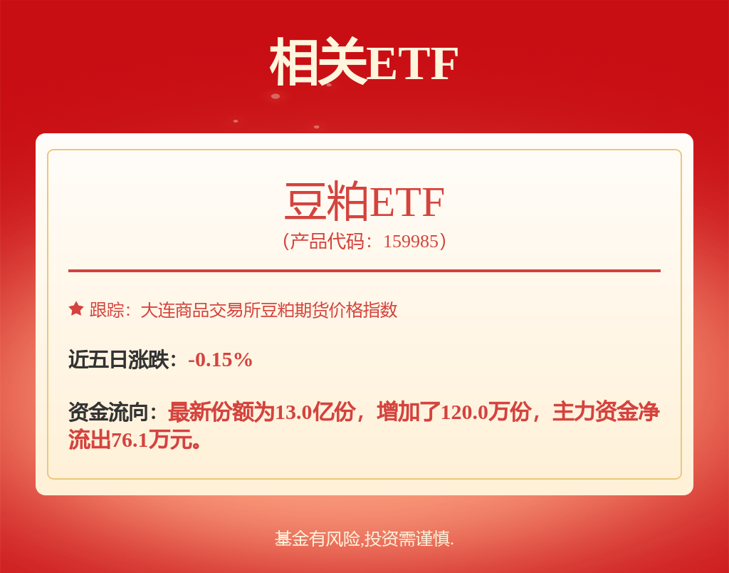 10月23日,豆粕期货市场早盘小幅拉升。截至上午10:30,豆粕ETF(159985)上涨1.55%。期货方面,当前豆粕2601合约为2922元/吨,上涨1.74%。现货方面,昨日天津地区豆粕现货价格2950元/吨,较前日持平。