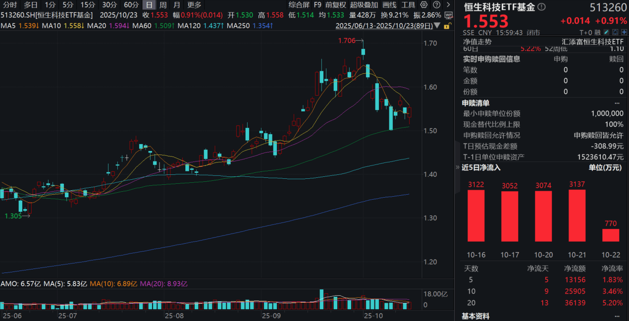 同类唯一15BP最低档管理费的恒生科技ETF基金(513260)收涨0.91%,全天成交额超6.5亿元,收盘溢价率高达1.25%,连续获资金“顶格”申购,近20日“吸金”超3.6亿元,最新规模超70亿元!基金融资余额再度走高,攀升至1.5亿元以上高位!