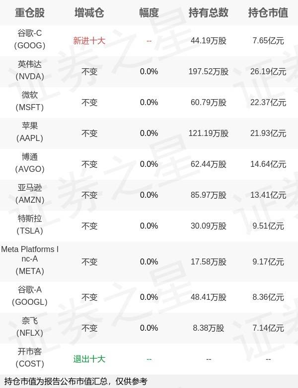 证券之星消息,10月28日广发基金旗下刘杰管理的广发纳斯达克100交易型开放式指数基金公布三季报,近1年净值增长率23.29%。与上一季度相比,该基金前十大重仓股新增谷歌-C;其中英伟达持仓占比9.02%,为该基金第一大重仓股;开市客等退出前十大重仓股;详细数据如下: