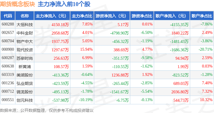 从资金流向上来看,当日期货概念板块主力资金净流出13.21亿元,游资资金净流入3.25亿元,散户资金净流入9.96亿元。期货概念板块个股资金流向见下表: