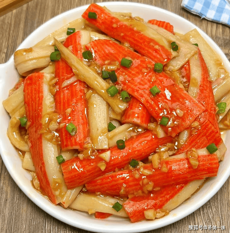 4.先将蟹柳条倒入锅中,接着快速地进行翻炒操作,如此一来,便能让每条蟹柳都极其均匀地裹上那美味可口的蒜香酱汁。